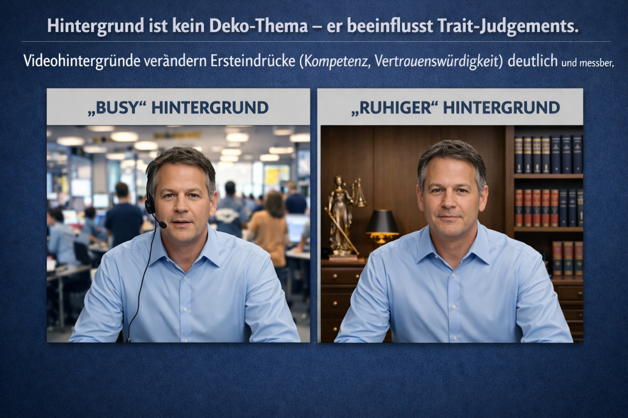 Videohintergründe verändern Kompetenz- und Vertrauensurteile messbar. Ihr Umgebung wird konstant in Ihre Bewertung einbezogen. Weshalb sollten Sie einen nichtssagenden (= blurr Hintergrund) oder einen statusreduzierende Bewertung als Anwalt / Anwältin einsetzen?